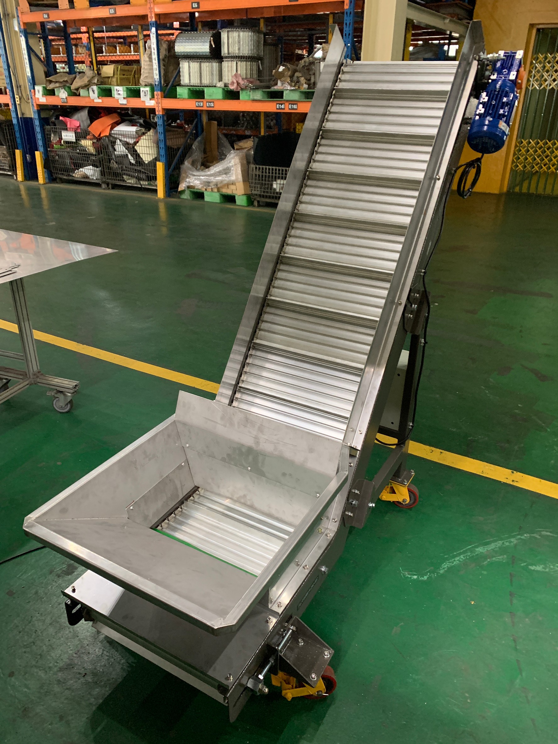 鐵帶輸送機是運送鐵件及重型物件較常使用的機型,由於鐵帶本身的硬度在輸送鐵件時往往會因為物件落料到輸送機上產生微小的碰撞並留下痕跡,加上鐵帶可能會生鏽的風險讓工件間接生鏽,