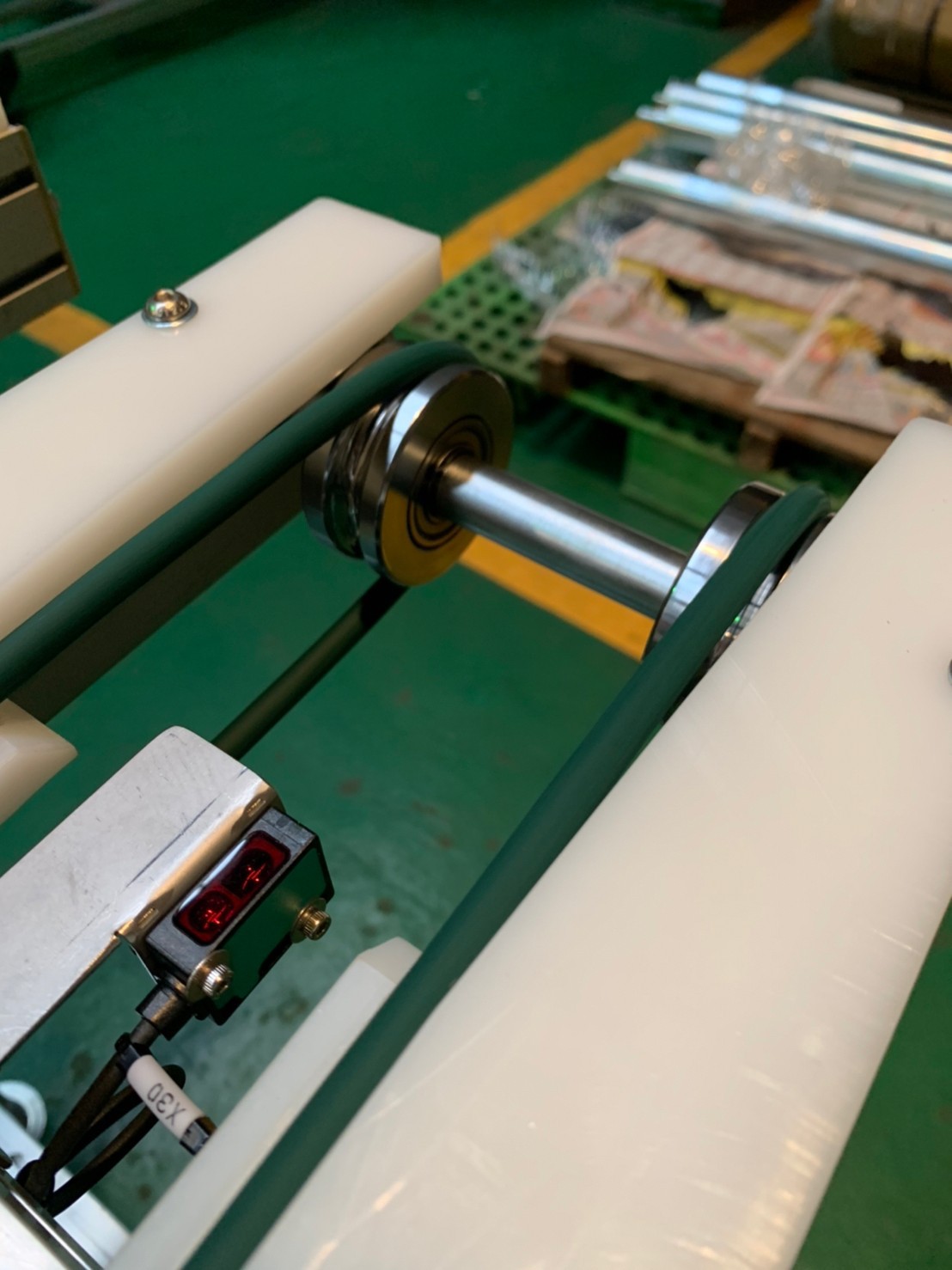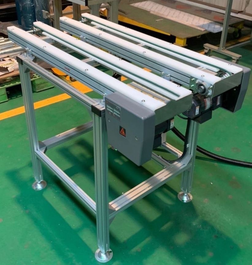 半導體產業在台灣占有舉足輕重的地位,自動化製造更是重要的一環,這台輸送機是產線的一部分設備,在電子面板加工後需要輸送至機械手臂吸盤點,再經由手臂吸取至下一站的產線,面板可接觸到帶面的地方只有四個邊,所以在設計上使用雙皮帶的方式輸送,盡可能減少輸送面積,另外搭配傳感器偵測功能,當偵測到物件手臂就會自動取走,達成效率之餘還能減少電子硬件的損壞。
