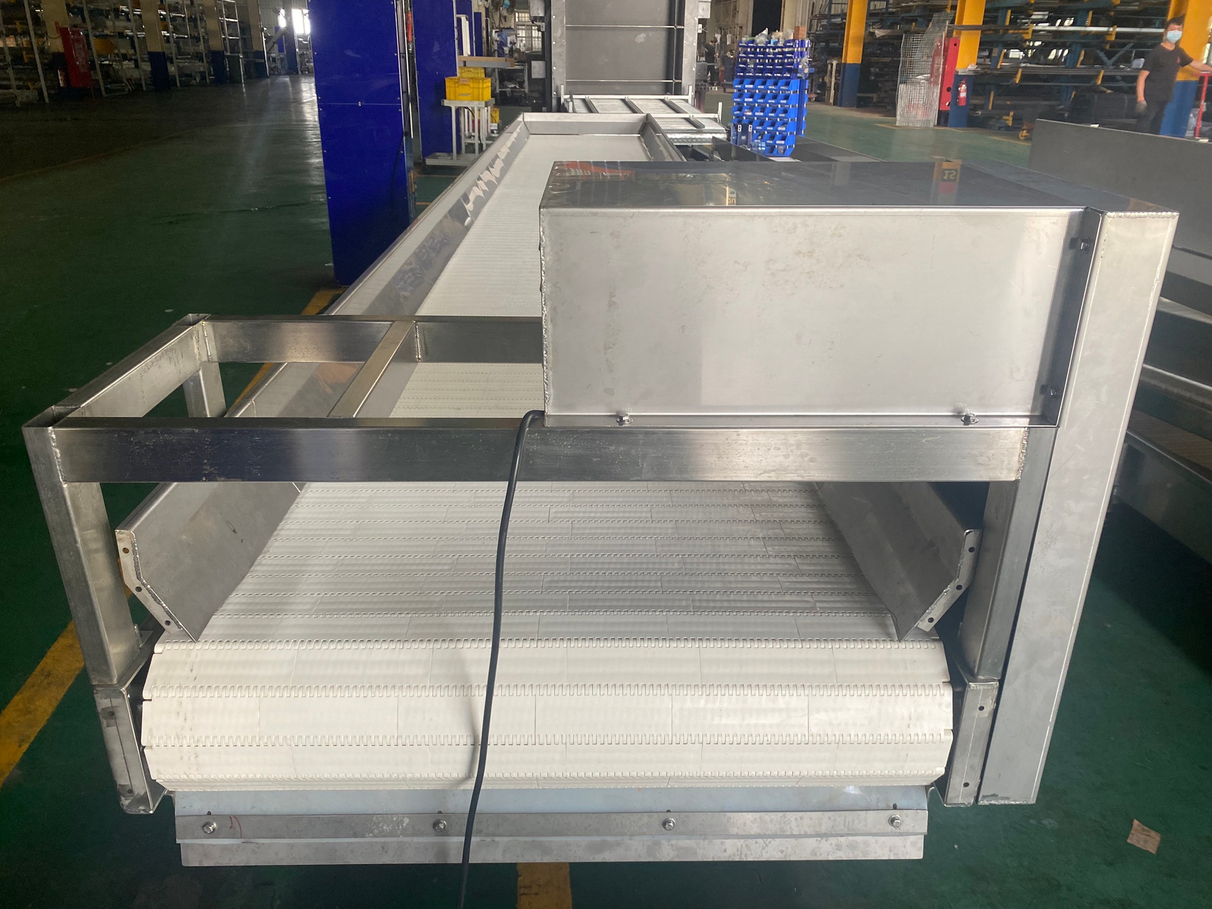 今天要介紹輸送機是儲水式頂板帶輸送機,這台主要的輸送物為加工染料塊,染料塊本身會有未凝固的染料,為了避免輸送帶上有污漬,頂板帶輸送機下方安裝的清洗用儲水桶,當工件送出後帶面會經過儲水桶清洗再進行輸送,機身設計比以往的機台還要寬,方便工作人員可以更方便清洗頂板帶。