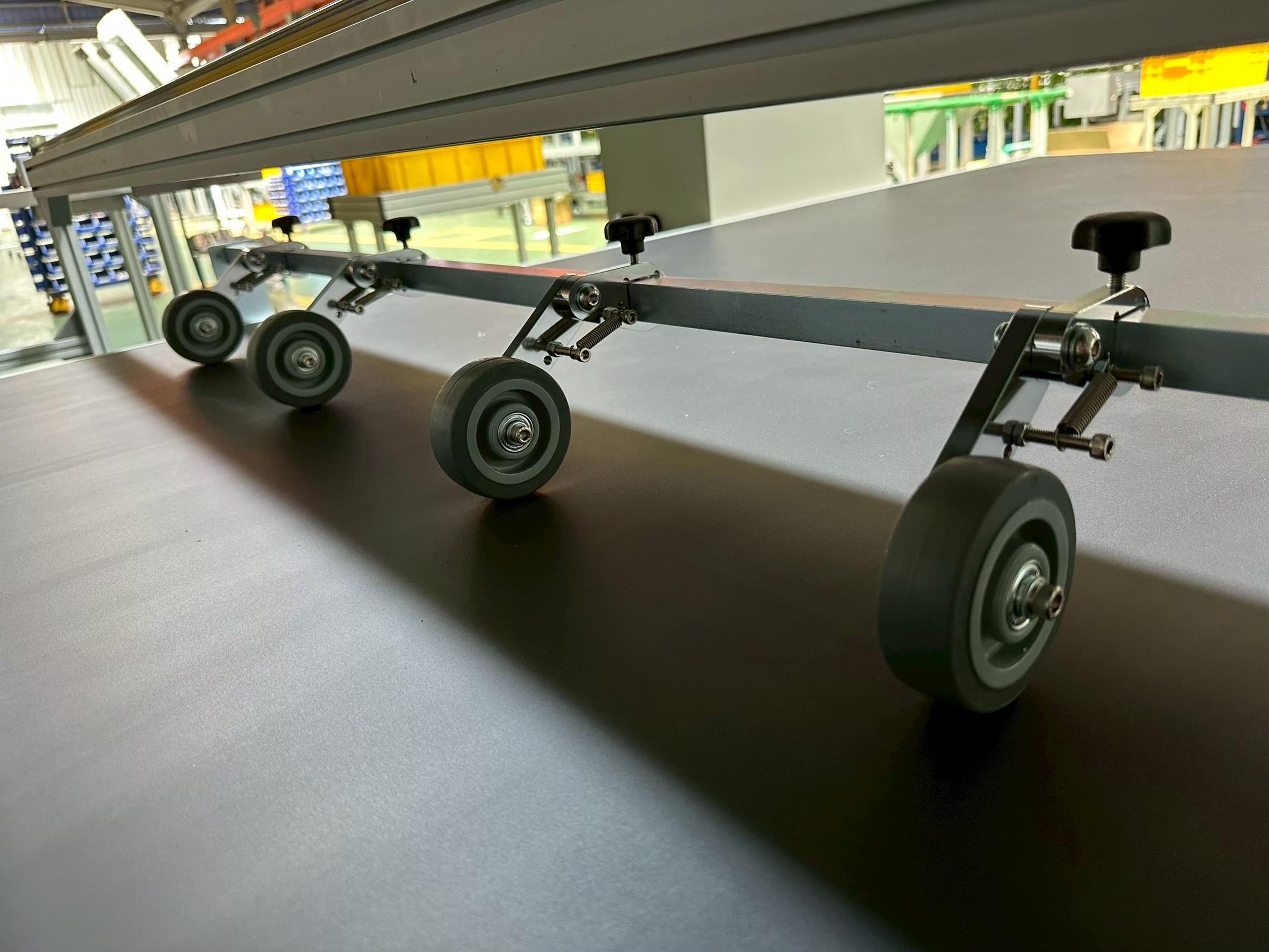 每組含四個可調間距壓輪,透過小把手即可快速微調,確保不同厚度紙箱皆能穩定貼合輸送面,防止跑偏與震動,維持輸送平穩度與印字品質。
